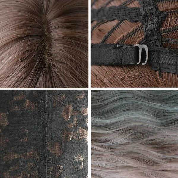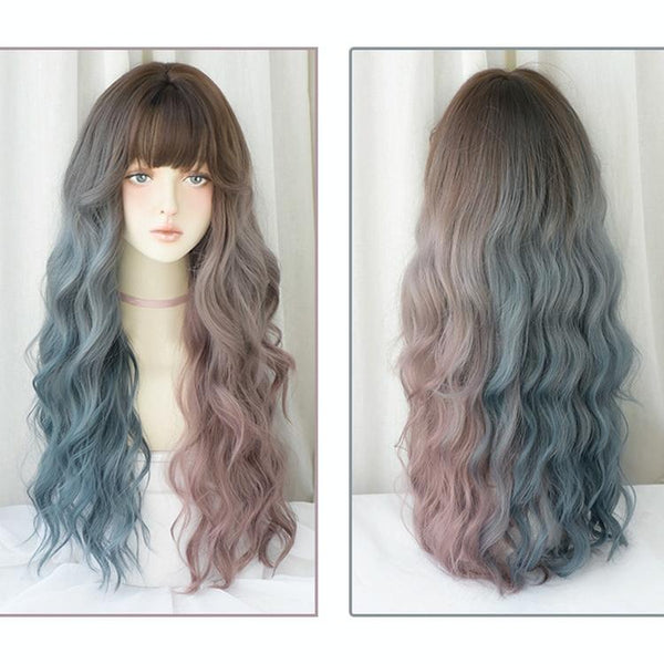 Wig Female Long Hair Full Headgear Big Wave Two-Color Full Bangs Headgear(Dradient Mint Cherry 76CM)