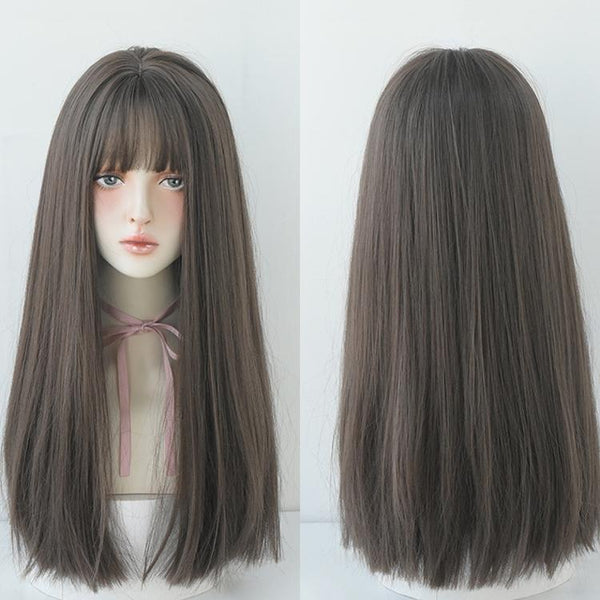 Wig Female Long Hair Full Headgear Straight Hair Natural Air Bangs Full Top Wig(Cool Brown 58CM)
