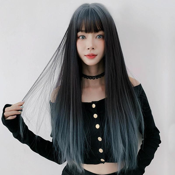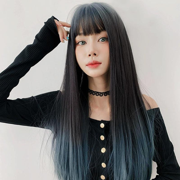 Wig Female Long Hair Gradient Air Bangs Full Top Long Straight Hair(Lake Blue Feather 66cm)