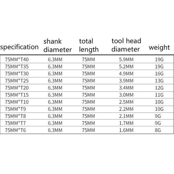 2. Specifications: 50mm including T5/T6/T7/T8/T9/T10/T15/T20/T25/T27/T30/T40, 75 mm and 100 mm including T6/T7/T8/T9/T10/T15/T20 /T25/T30/T35/T40, the diameter of the handle is 6.3 mm on both sides