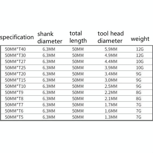 2. Specifications: 50mm including T5/T6/T7/T8/T9/T10/T15/T20/T25/T27/T30/T40, 75 mm and 100 mm including T6/T7/T8/T9/T10/T15/T20 /T25/T30/T35/T40, the diameter of the handle is 6.3 mm on both sides