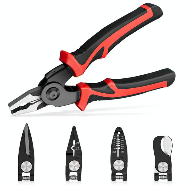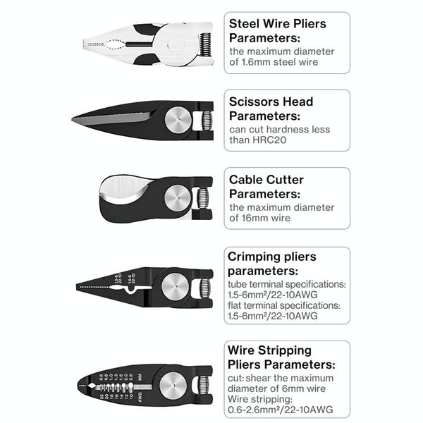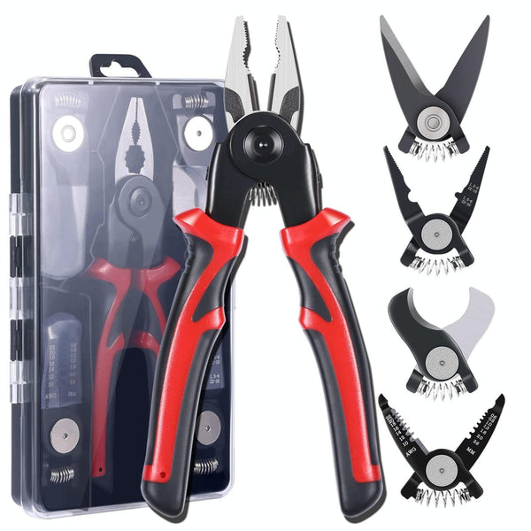 1. Multifunctional tool: 5-in-1 interchangeable head pliers set, including wire strippers, crimping pliers, cable cutters, sheet metal cutters, wire cutters, meeting various needs of home electricians and repairs.