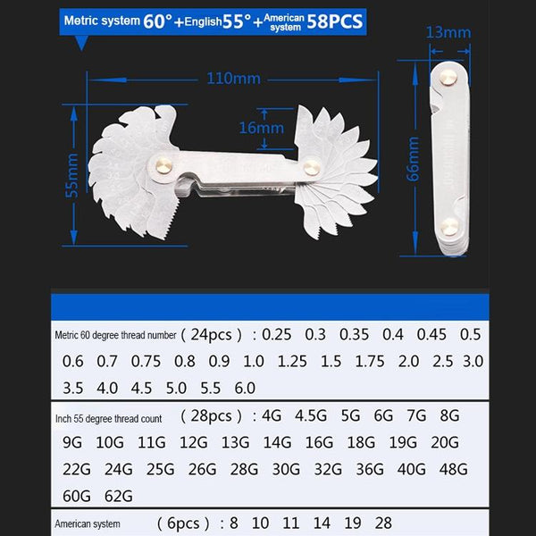 58 PCS Metric 60 Degrees +British 55 Degrees CR Stainless Steel Thread Gauge