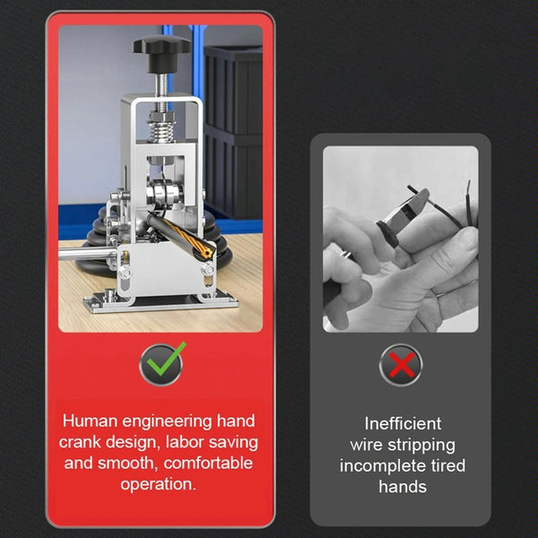 6. Hand crank and drill (not included) drive, humanized hand crank design, labor-saving, smooth, comfortable operation, can be driven by external hand crank, can also be connected to the drill will be converted into an electrical wire stripping machine, in order to improve the ability of stripping wire