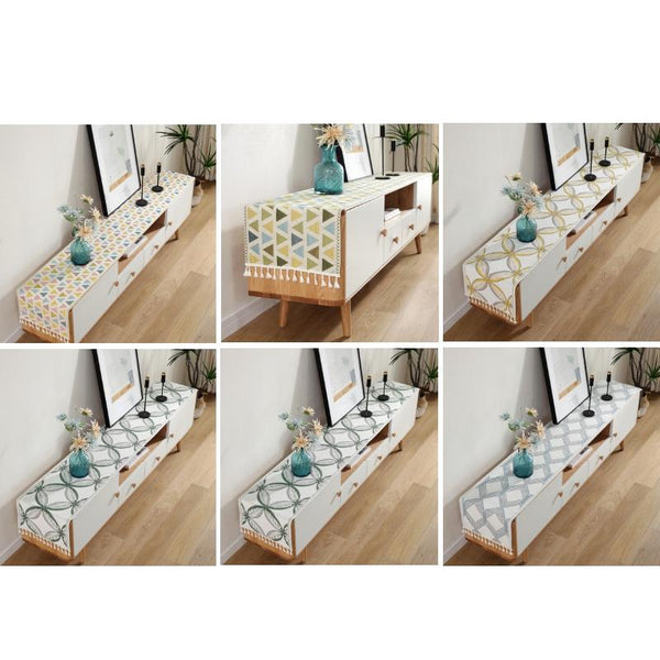 Home TV Cabinet Shoe Cabinet Chenille Polyester Tassel Tablecloth, Size: 35x220cm(Blue Geometry)