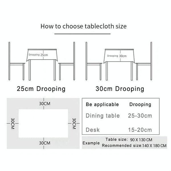 2. Table width + 2 x sag amount ( 25/30cm) = tablecloth width, table length + 2 x sag amount (25/30cm) = tablecloth length