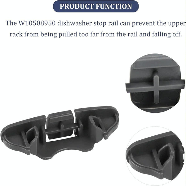 1. The W10508950 dish rack stopper clip is used to prevent the upper dish rack from sliding completely off the rail.