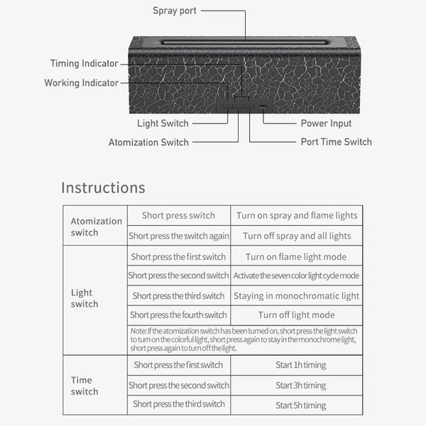 1. Colorful simulated flame; essential oil aromatherapy can be added for fine atomization;