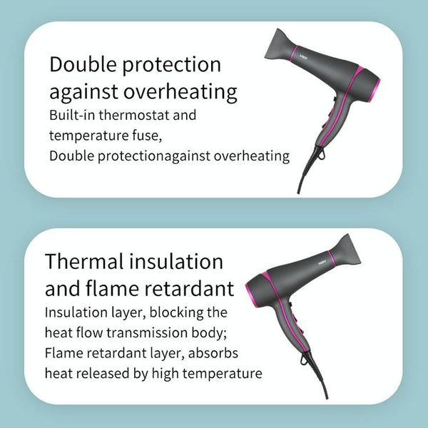 6. An intelligent temperature control protection system is installed inside the hair dryer. When the temperature exceeds the limit temperature, the overheating device will automatically stop the machine, allowing you to use it with peace of mind