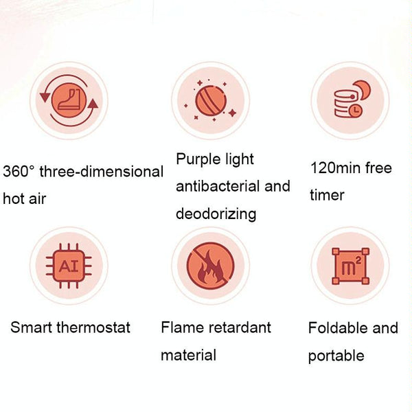 2. Functions: three-dimensional hot air, purple light antibacterial and deodorizing, free timer, intelligent constant temperature, flame retardant material, foldable and portable