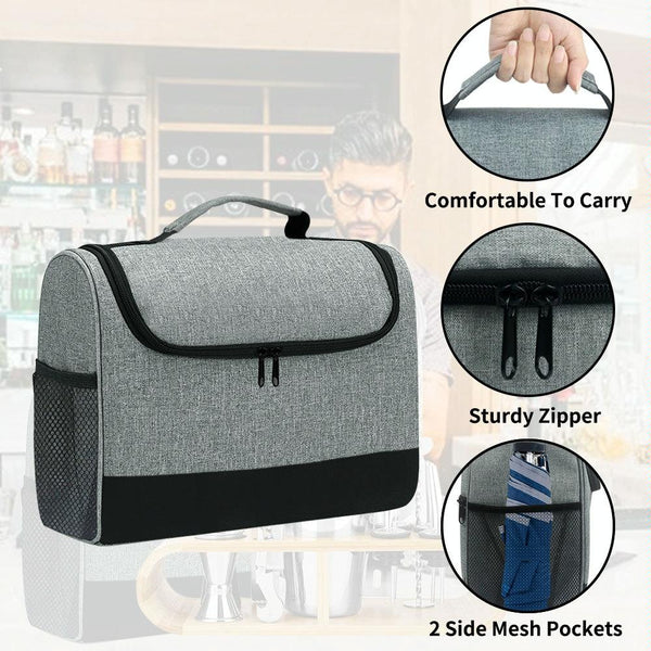 1. Main compartment has multiple elastic top pockets to store bar tool kits such as cocktail shakers, double sided measuring cups, ice tongs, mortar and pestle, mixing spoons, strainers, bottle openers, etc. Side and back pockets to carry what you need. (Package only, tool set not included.)