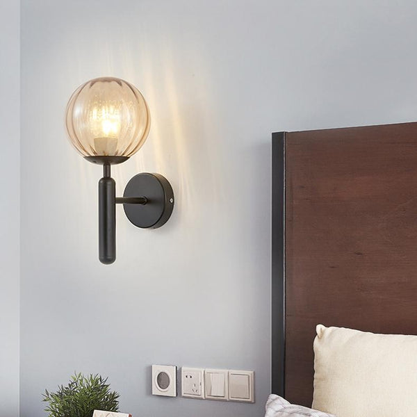 6102 Round Glass LED Wall Light Hotel Bedroom Bedside Living Room, Power source: Without Light Bulb( Copper Color Striped Amber Lampshade)