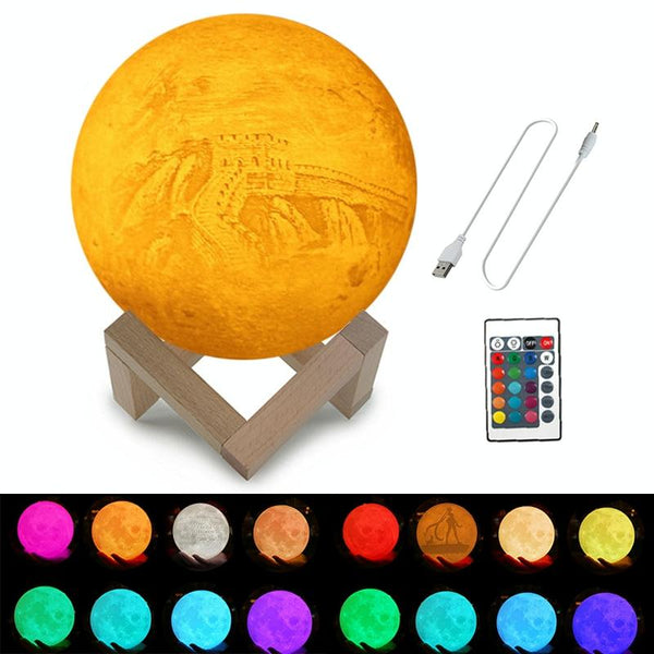 Customized 16-colors 3D Print Lamp USB Charging Energy-saving LED Night Light with Remote Control & Wooden Holder Base, Diameter:8cm
