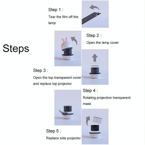 -Direct plug-in version: projection lamp, 6 types of side projection films, 6 types of top projection films, USB charging cable, manual, certificate