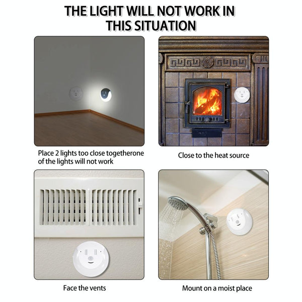 - The sensing area of the product surface cannot be covered by other objects, otherwise the sensing sensitivity will be affected. If you use a charger to charge, please use a 5V/1A charger. When charging, the lamp must be taken out to ventilate and charge. Avoid installing near heat sources, such as air conditioning outlets, heating outlets, humidifiers, etc., where the temperature changes drastically, and avoid installing in direct sunlight.