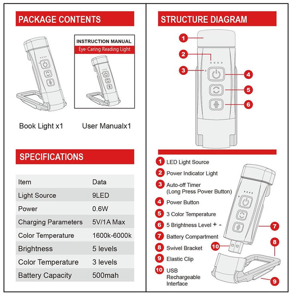 USB Charging Portable Detachable Reading Clip Light Rotatable Eye Protection Mini LED Lamp(White)
