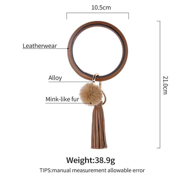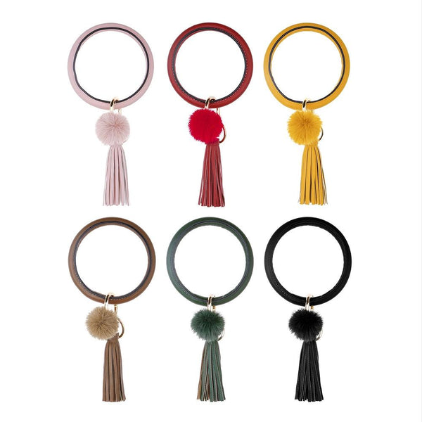 2 PCS Fringed Bracelet Keychain Circle Anti-Lost PU Leather Hairball Bracelet Keyring Pendant( Pink)