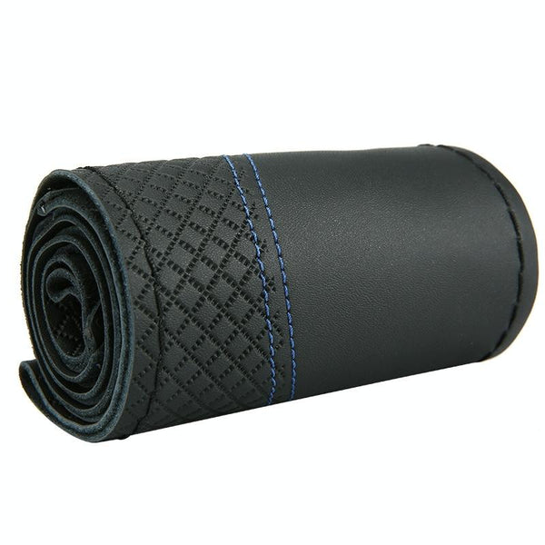 38cm Cowhide Embossed Hand-Stitched Double-Line Steering Wheel Cover(Black Blue Line)