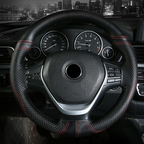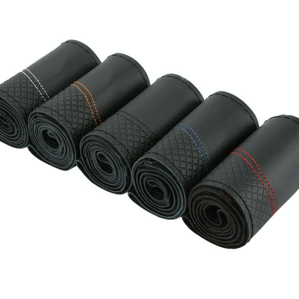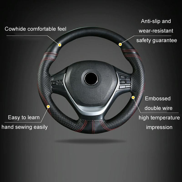 38cm Cowhide Embossed Hand-Stitched Double-Line Steering Wheel Cover(Black Orange Line)