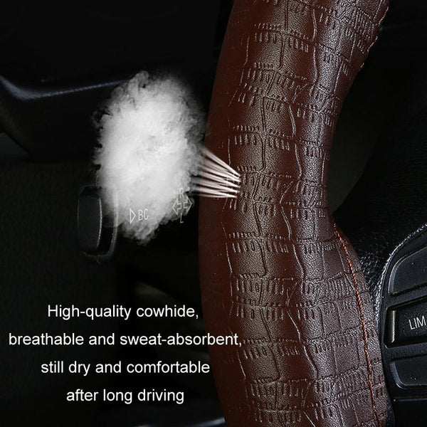 38cm Four-season Embossed Cowhide Hand-sewn Steering Wheel Cover(Wine Red)