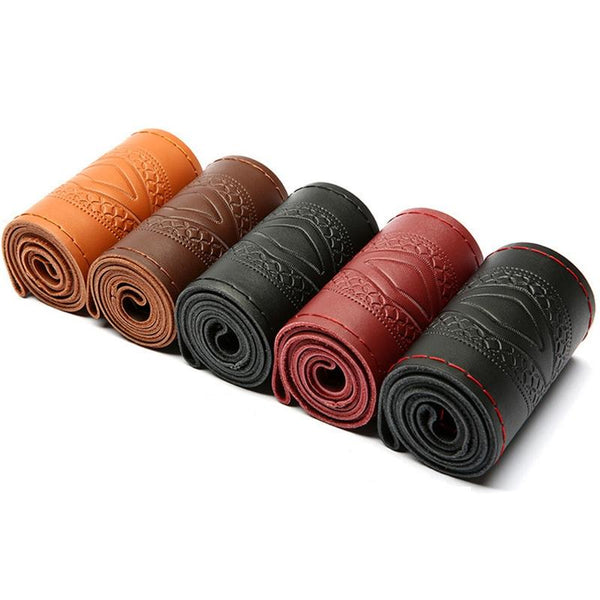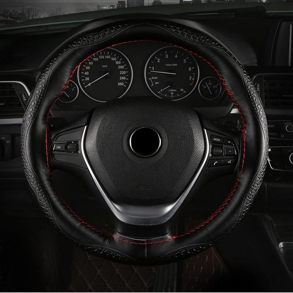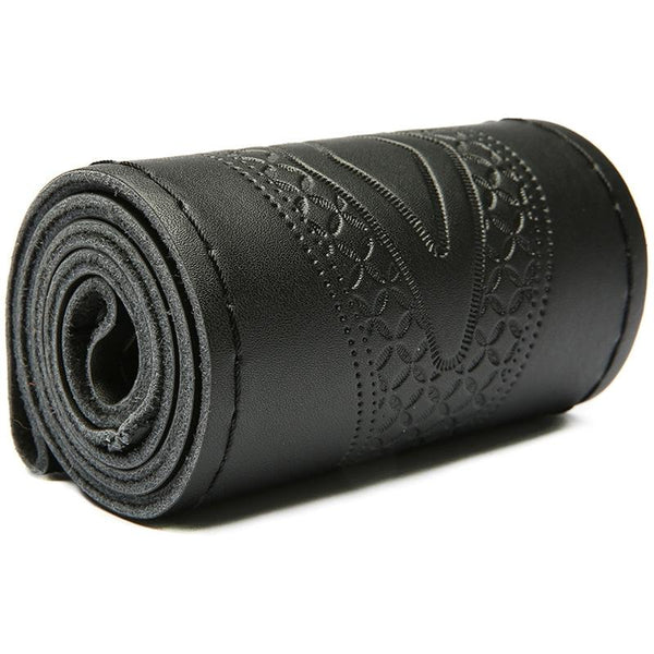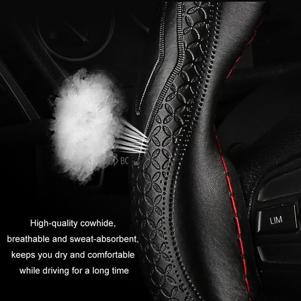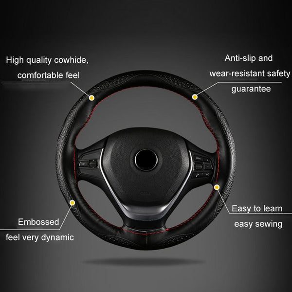 38cm Four-Season Embossed Hand-Sewn Cowhide Steering Wheel Cover(Black+Black Line)