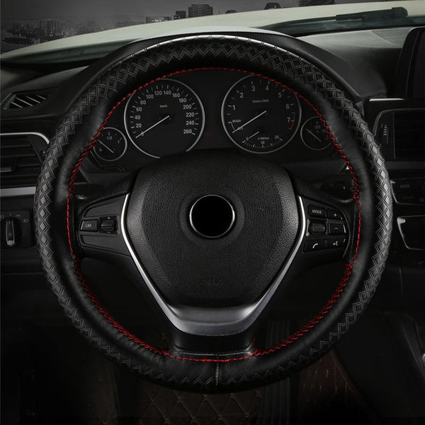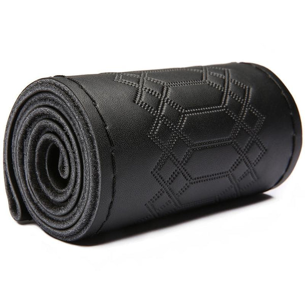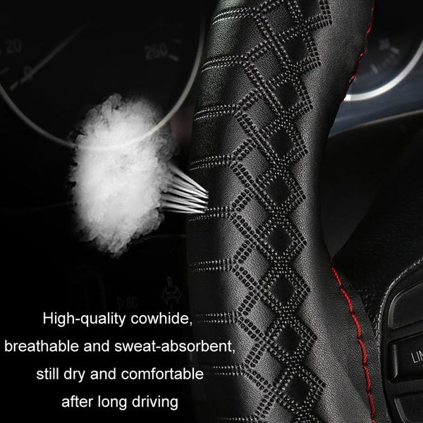 38cm Four-season Embossed Hand-sewn Cowhide Steering Wheel Cover(Black+Black Line)