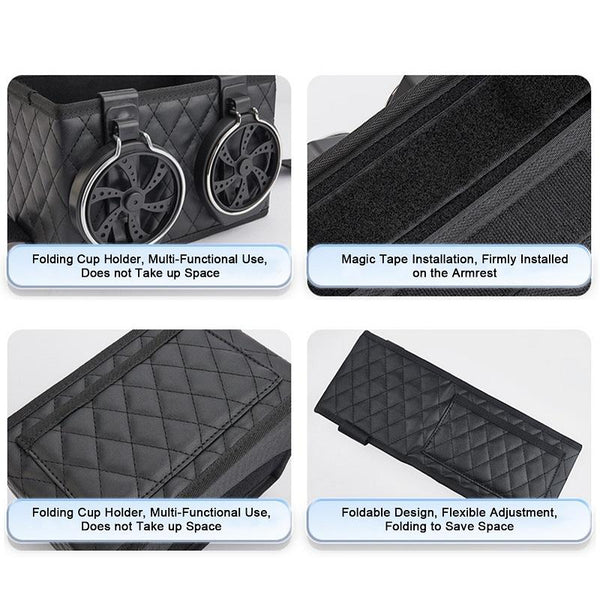 Car Armrest Box Folding Storage Box Multifunctional Water Cup Holder(Leather Black)
