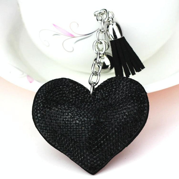 Heart Keychain Leather Tassel Gold Key Holder Metal Crystal Key Chain Keyring Charm Bag Auto Pendant Gift(black)