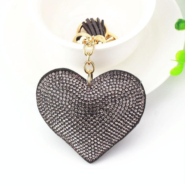 Heart Keychain Leather Tassel Gold Key Holder Metal Crystal Key Chain Keyring Charm Bag Auto Pendant Gift(black gray)