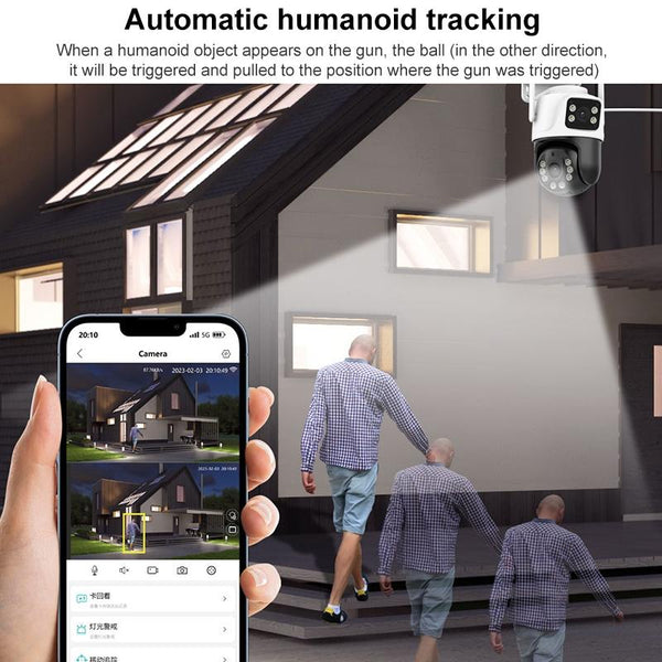 Enhance your home security with this Dual Camera WiFi Security System featuring Colour Night Vision. Capture crucial details with 2304x2592 resolution on the main camera and 800x896 on the secondary camera. Benefit from advanced features like humanoid detection, two-way audio, and smart tracking. The system supports up to 256GB of storage via TF card (not included) and offers cloud storage options for added peace of mind. Enjoy seamless remote viewing and control on your iOS or Android device via the dedicated app. With H.265AI video compression, 12 frames per second recording, and a wide viewing angle (70°/92°), this system ensures comprehensive coverage. The innovative bionic hybrid light and infrared design provides clear colour night vision, eliminating light pollution. Connect easily via WiFi (IEEE802.11b/g/n, 2.4GHz) or Ethernet. Onvif and NETIP protocol support ensure compatibility with a wide range of security systems. Powered by 12V DC, this system is energy-efficient, consuming only 10W. Experience enhanced security with features like gun-ball linkage, multiple cloud technologies, and push notifications directly to your mobile phone.