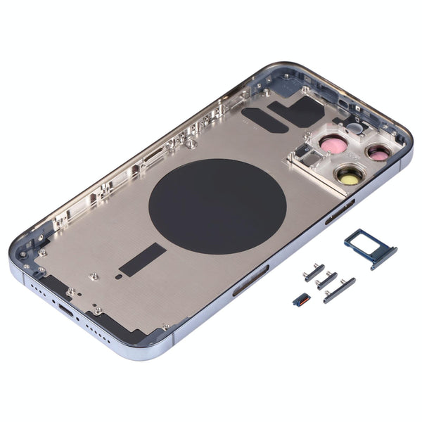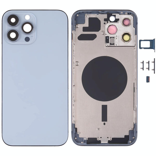 Keywords: iPhone 13 Pro Max, back cover replacement, blue back cover, SIM tray, camera lens, repair, replacement part, iPhone repair, mobile phone repair, high-quality, pristine condition.