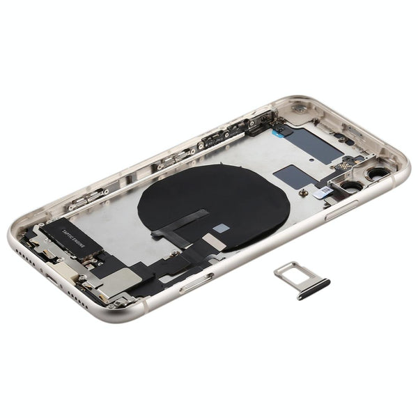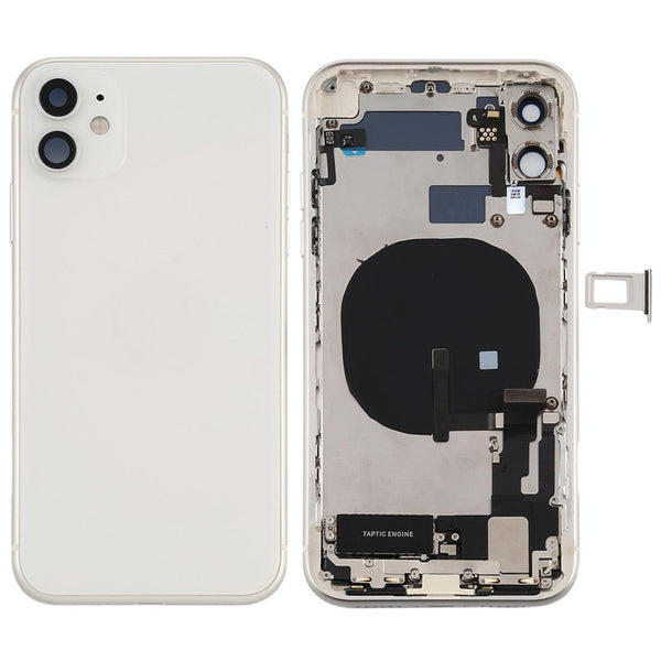 Restore your iPhone 11 to its former glory with this complete Battery Back Cover Assembly in pristine white. This comprehensive replacement includes everything you need: side keys (power and volume buttons with flex cable), wireless charging module, vibration motor, charging port, loudspeaker, SIM card tray, and camera lens cover. This assembly is perfect for replacing a broken, scratched, or malfunctioning back cover, giving your iPhone 11 a fresh new look and feel.
