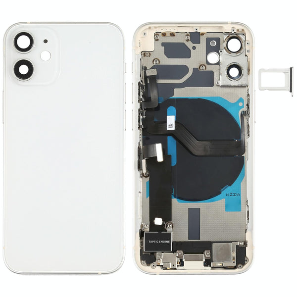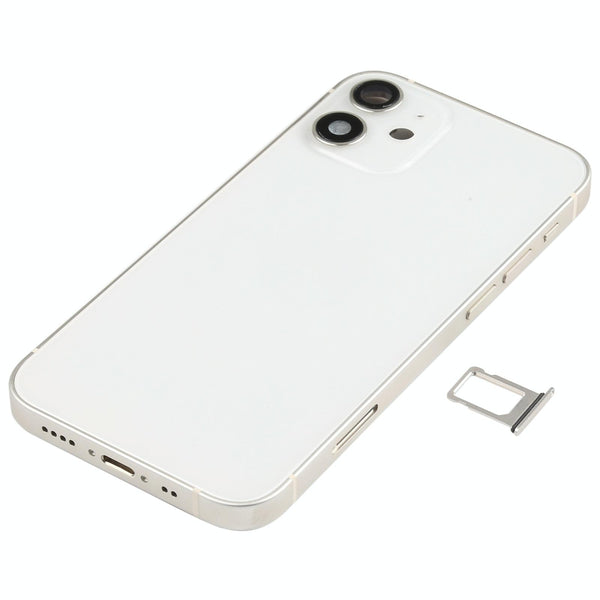 Search terms: iPhone 12 Mini, back cover, rear housing, replacement part, white, wireless charging, side keys, camera lens, SIM tray, loudspeaker, repair, fix, broken, damaged.