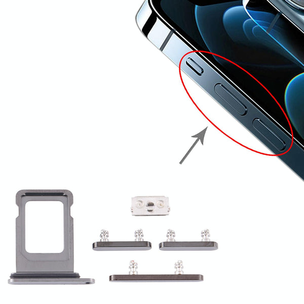 Search terms: iPhone 12 Pro, SIM tray, SIM card tray, side buttons, side keys, power button, volume buttons, volume up, volume down, graphite, replacement part, repair, iPhone repair, mobile phone repair.