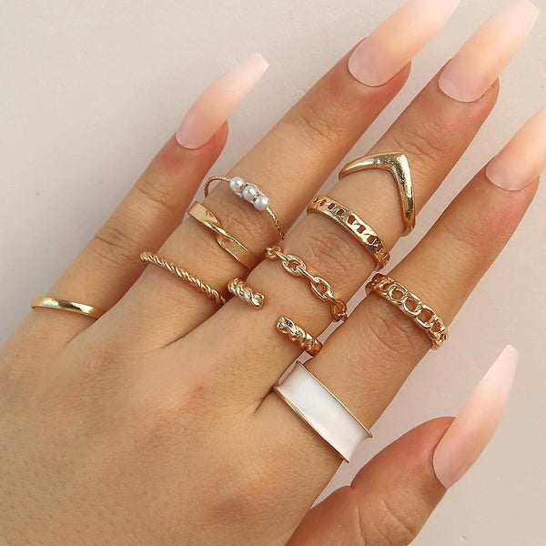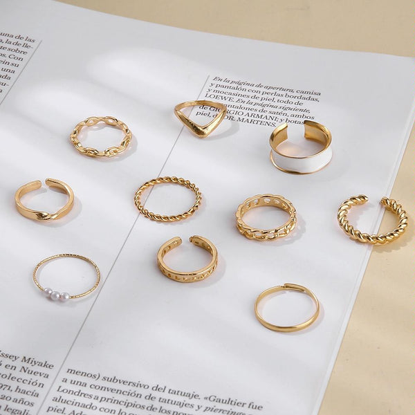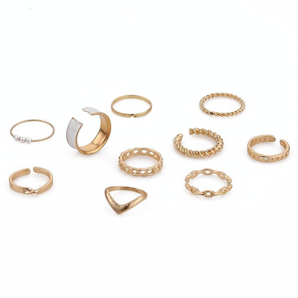 10pcs/set Multi-Metal Twisted Pearl Hollow Open Ring(SKU6165 Gold)