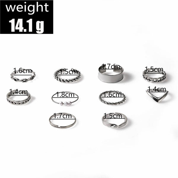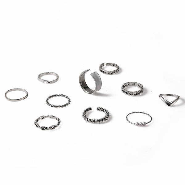 10pcs/set Multi-Metal Twisted Pearl Hollow Open Ring(SKU6234 Silver)