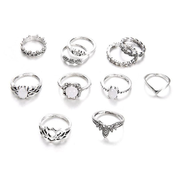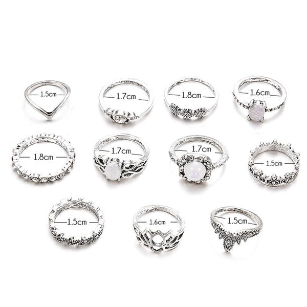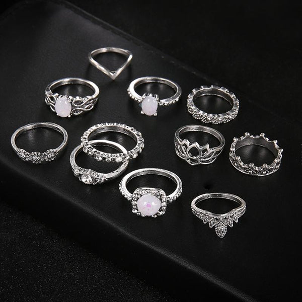 11 PCS/Set Bohemian Retro Totems Opal Lotus Crystal Hollow Ring Set