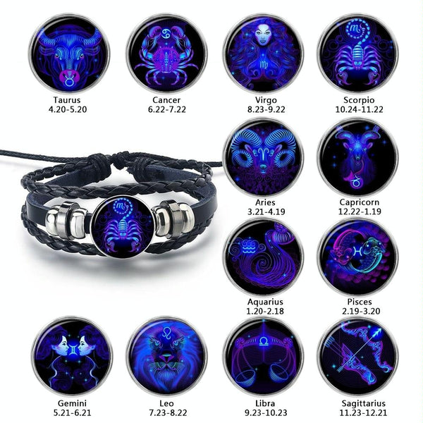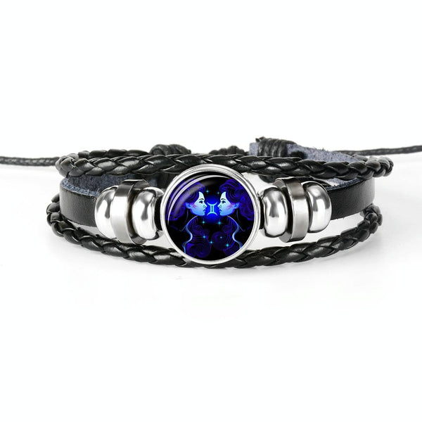 12 Constellation Black Braided Leather Glass Dome Punk Men Bracelet(Gemini)