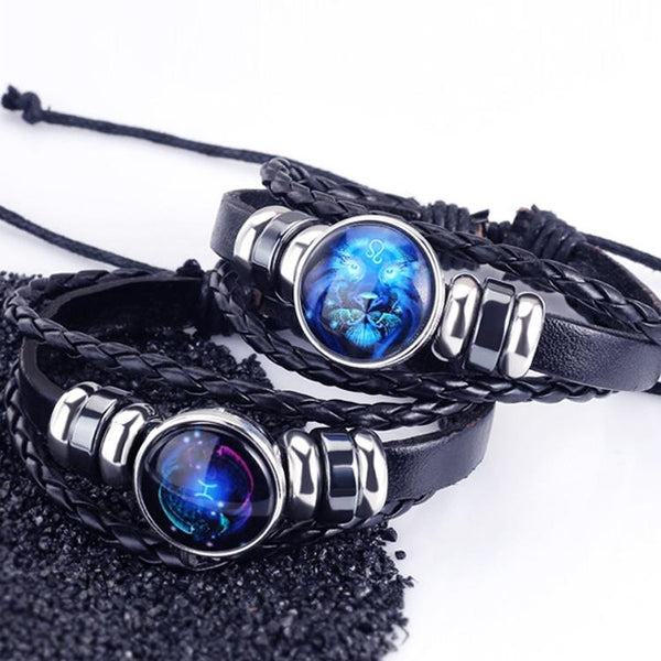 12 Constellation Black Braided Leather Glass Dome Punk Men Bracelet(Taurus)