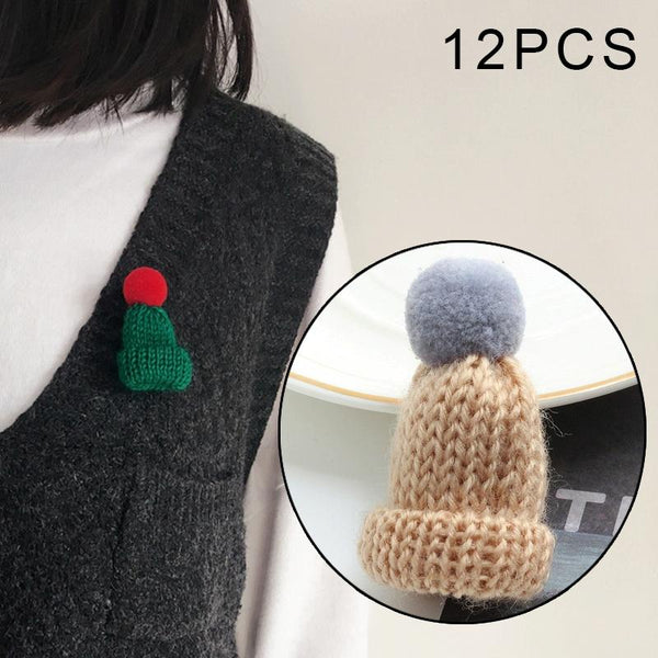 12PCS Cute Mini Knitted Hairball Hat Brooch Sweater Pins Badge(Light coffee)