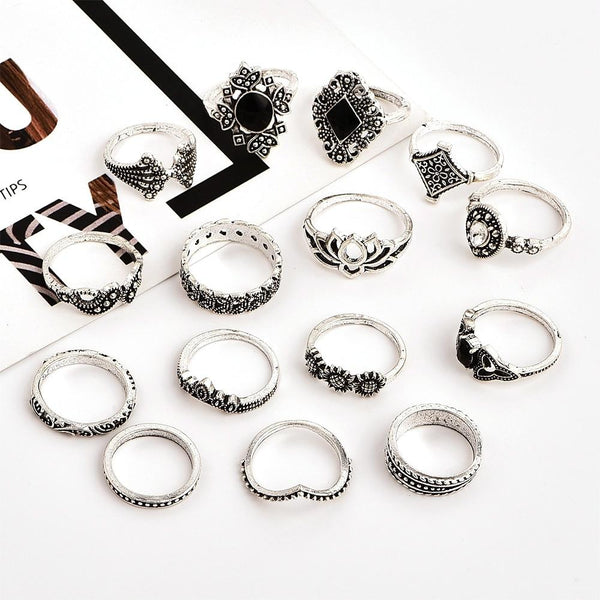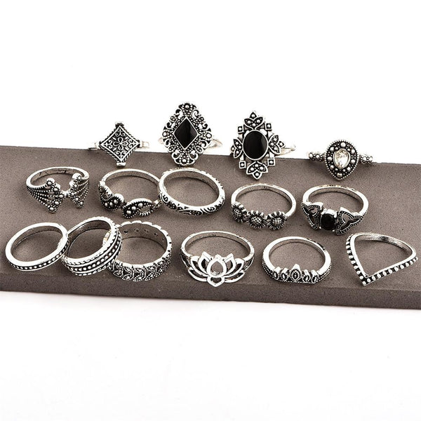 15 PCS Bohemian Retro Crystal Flower Leaves Hollow Lotus Gem Silver Ring Set