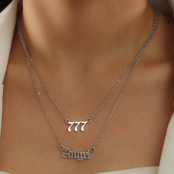 2 In 1 Angel Lucky Numbers Layered Necklace Set Women Collarbone Chain Jewelry, Style: Angel+4 Silver