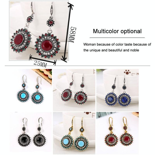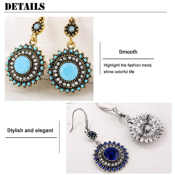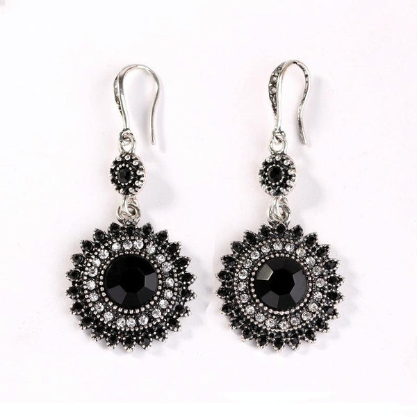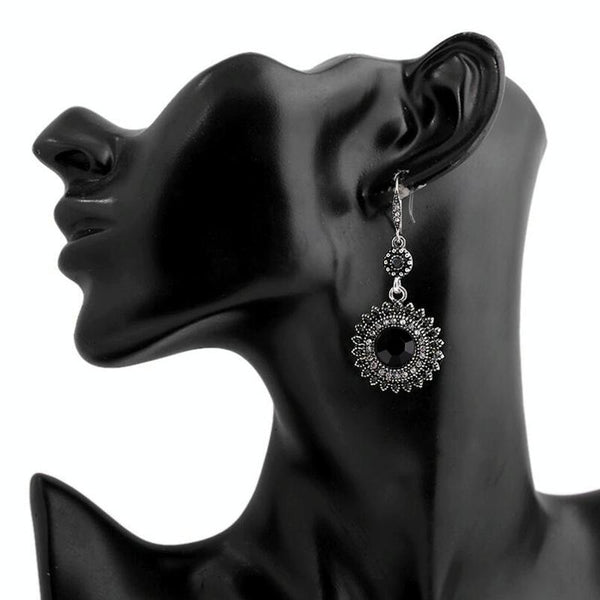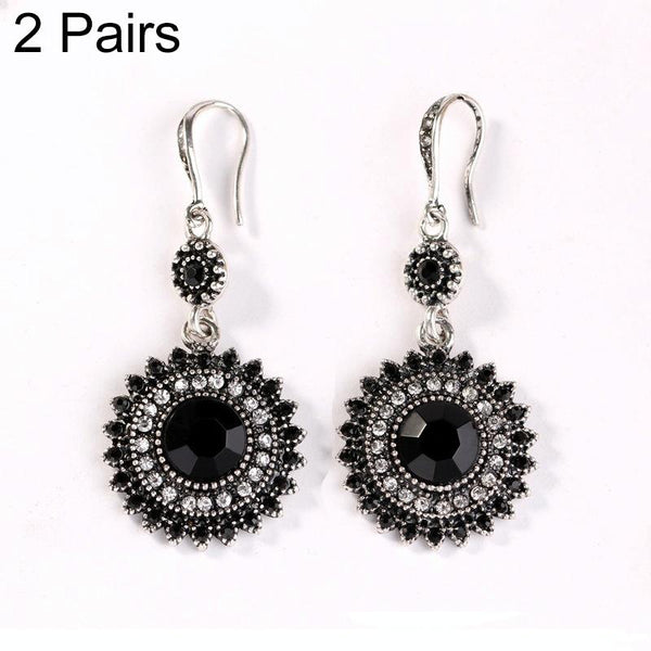 2 Pairs Ethnic Sun Flower Style Rhinestone Earrings Long Earbobs(Silver+Black)