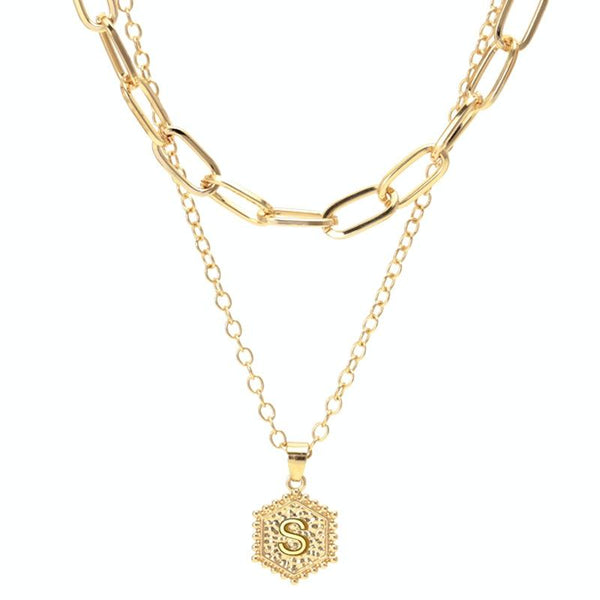 26 Alphabet Double Layer Necklace Hexagonal Letter Pendant Layered Collarbone Chain, Style: S