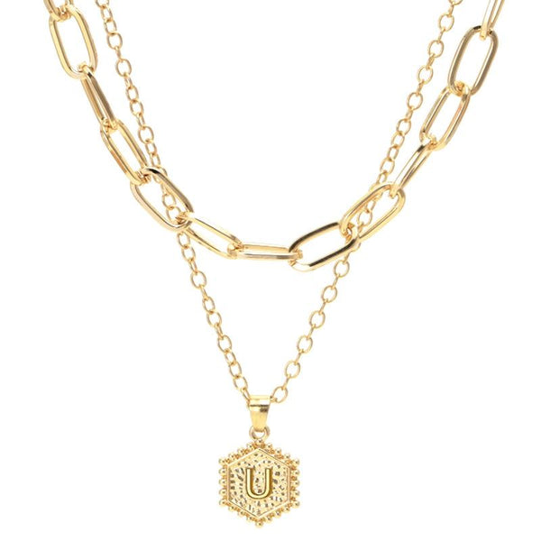 26 Alphabet Double Layer Necklace Hexagonal Letter Pendant Layered Collarbone Chain, Style: U