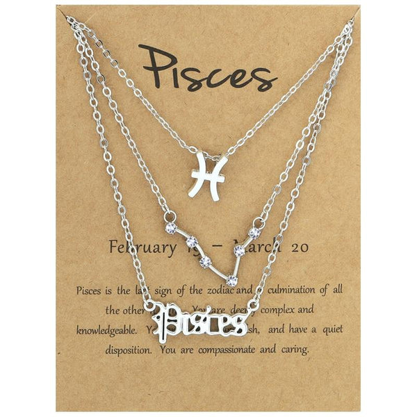 3 In 1 12 Zodiac Signs Necklace Set Retro Alphabet Symbols With Diamonds Jewelry Set, Style: Pisces Silver