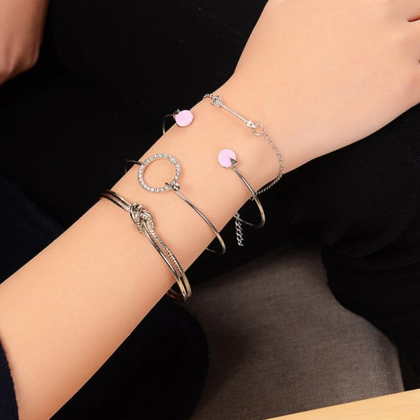 4 PCS/Set Arrow Multilayer Open Adjustable Round Crystal Bracelet Set for Women(silver)