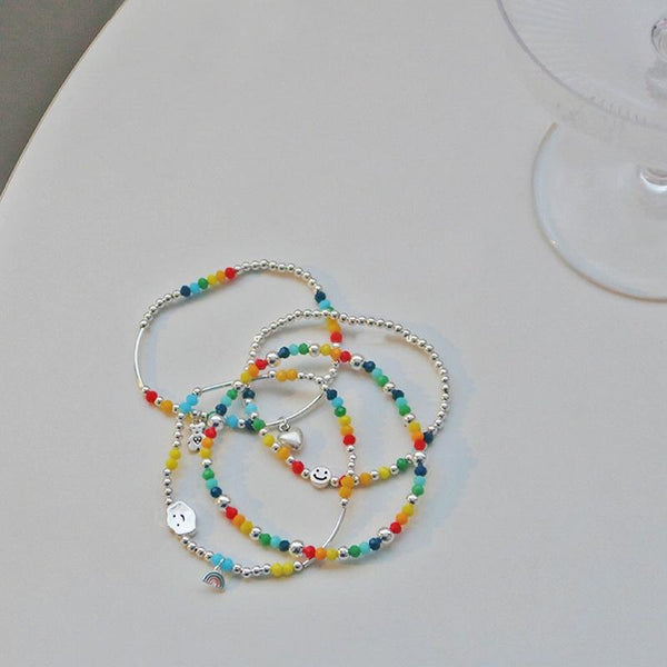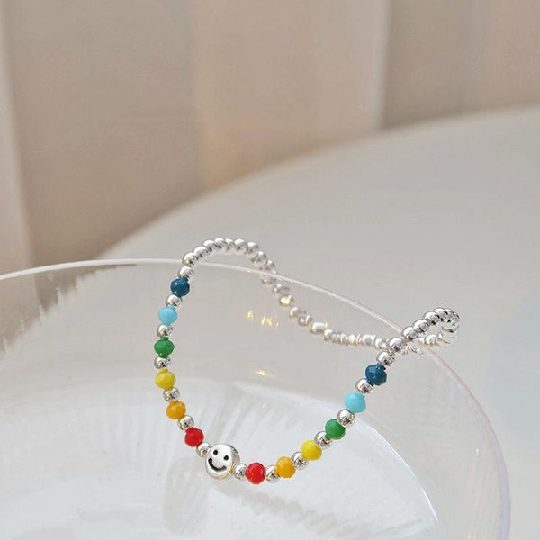 925 Silver Plated Rainbow Smile Beaded Bracelet Ladies Jewelry, Color: Smile Face