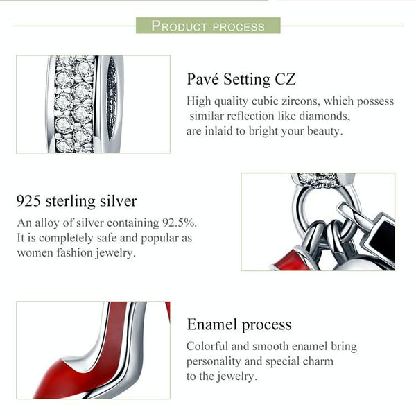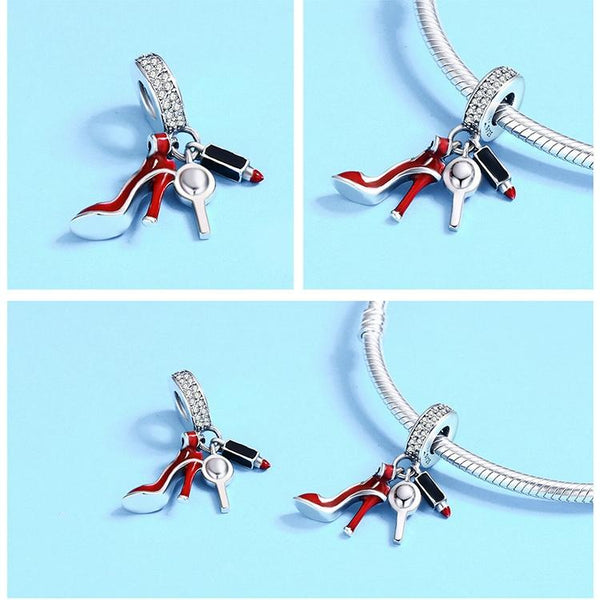 925 Sterling Silver Charm Red Lipstick High Heels Makeup Mirror Pendant