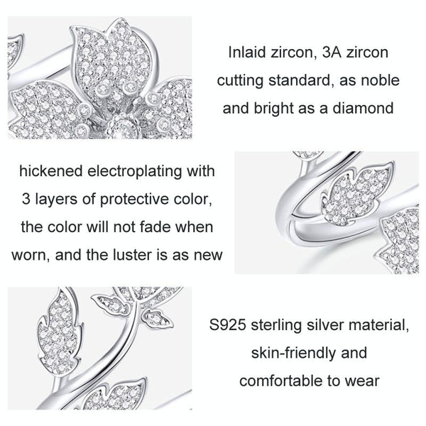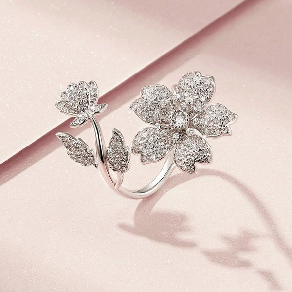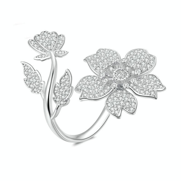 BSR076 Sterling Silver S925 White Gold Plated Zircon Cherry Blossom Open Adjustable Ring